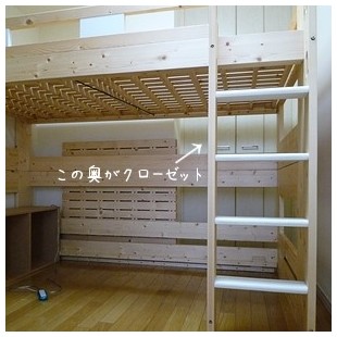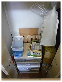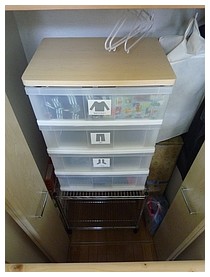 スペース有効利用の為、扉の前にロフトベッドを配置した子供部屋のクローゼット(記事はコチラ)。出し入れに多少手こずるものの、子供のシーズンオフの衣類やオモチャの空き箱、思い出ボックス等頻繁に出し入れするようなものは入っていないのでそのままにしてました。