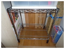 やっぱり引き出しの衣類をベッドの上から出し入れできる方が使い易いのかな~と思うようになり、この間クローゼット整理で使わなくなったワイヤーシェルフの一部を使って引出しをベッドの上から出し入れできる高さにしてみました。
