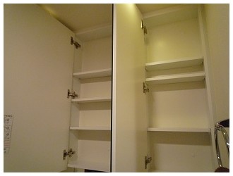 三面鏡裏の収納には洗剤やシャンプー類のストックが入れてあります。