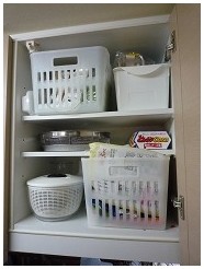 吊戸棚は基本的にカゴ収納なので、棚の中身をすべて出してアルコールスプレーで拭き掃除、カゴは食器用洗剤で丸洗いです。カゴ収納は手の届きにくい最上段に入れたものでも簡単に取り出せるので使い勝手は良いのですが、カゴを洗うのが結構面倒でした。
