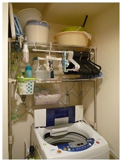 ゆくゆくはランドリーラック上部を突っ張り棒&カーテンで目隠ししてしまいたいと思ってます。でも最上段に載っているバケツや金魚の水替えグッズなんかが取り出しづらくなるかな~と思ってみたり。