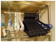 ワイシャツやカットソーなどハンガーに掛けられるものは掛けて干し、乾いたらそのまま洋服ダンスに収納、我が家の洋服は基本的に掛ける収納なのです。ハンガーは子供用、大人用、ハイネック&タートル用と用途別に使い分けているので、目当てのものが片手で簡単に取り出せることが大事。なので、カゴ等に入れて絡まったりするとイライラするのでバーに引っ掛け方式。そして動線を考えると収納場所はぜひこの場所が良いのです。