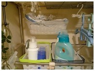 下段の棚板を外して奥行きにピッタリのカゴをはめ込み、洗剤類はその中へ